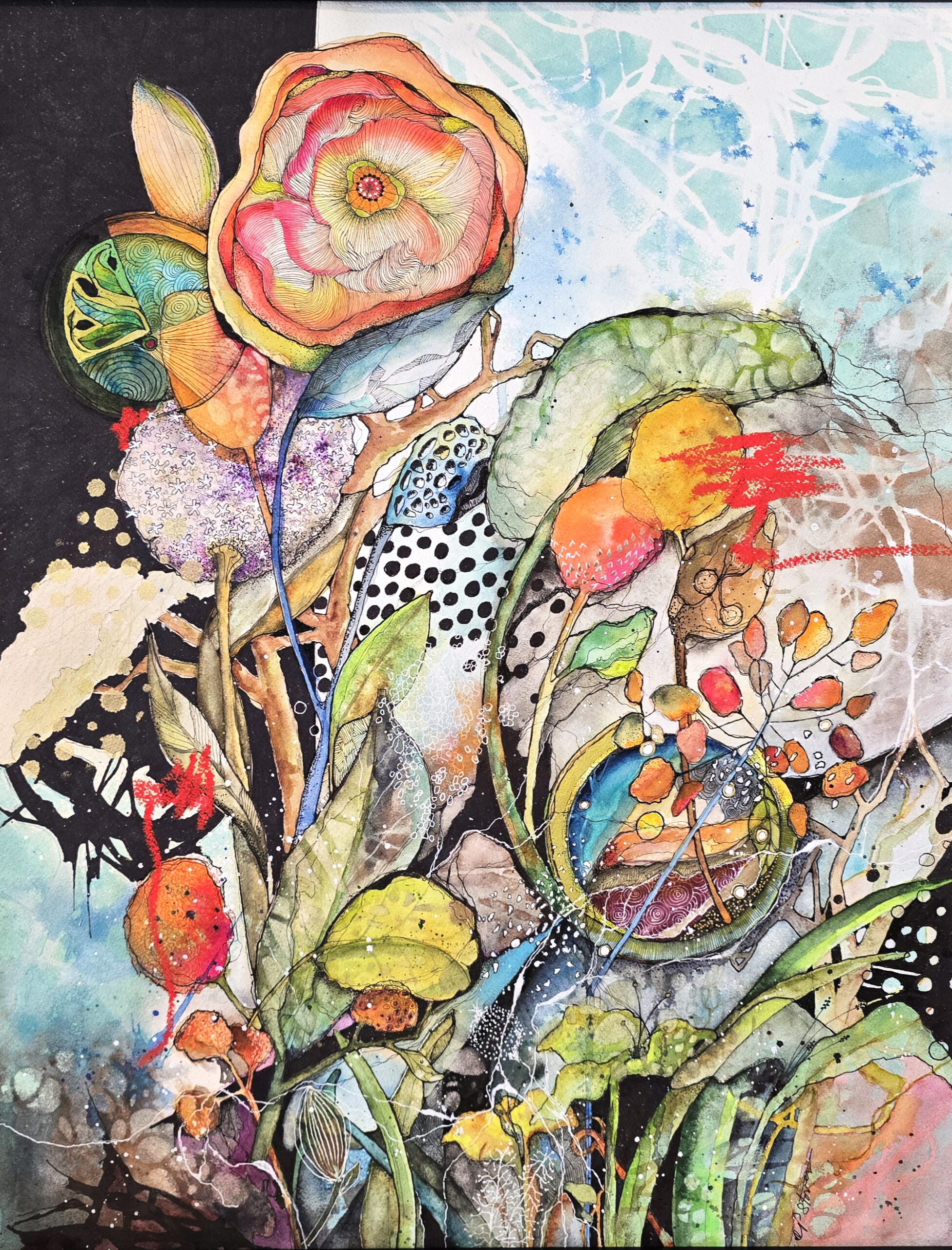 Original watercolor and ink abstract paintings incorporating organic movement with geometric anchors. Painted on Arches watercolor paper with gold leaf accents.