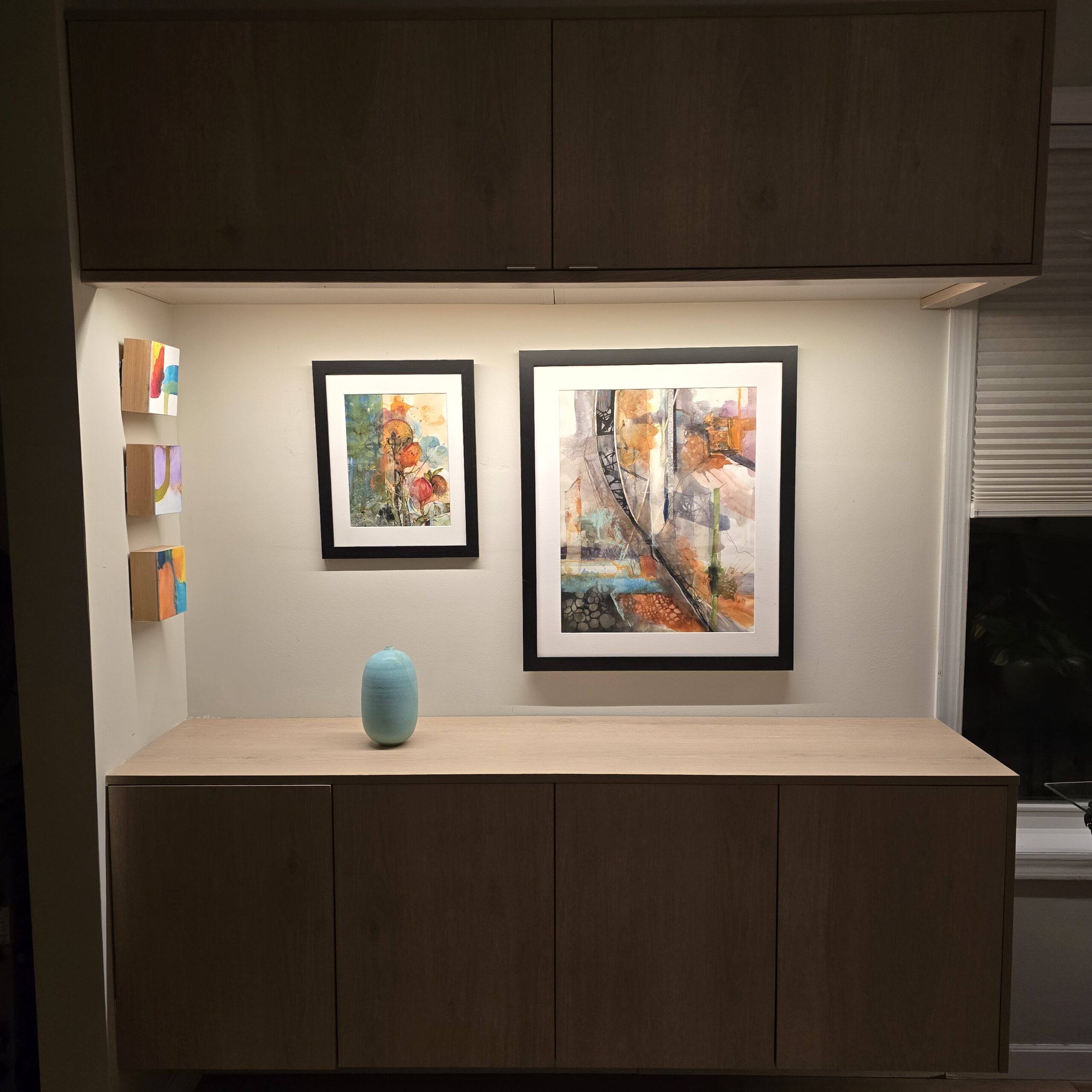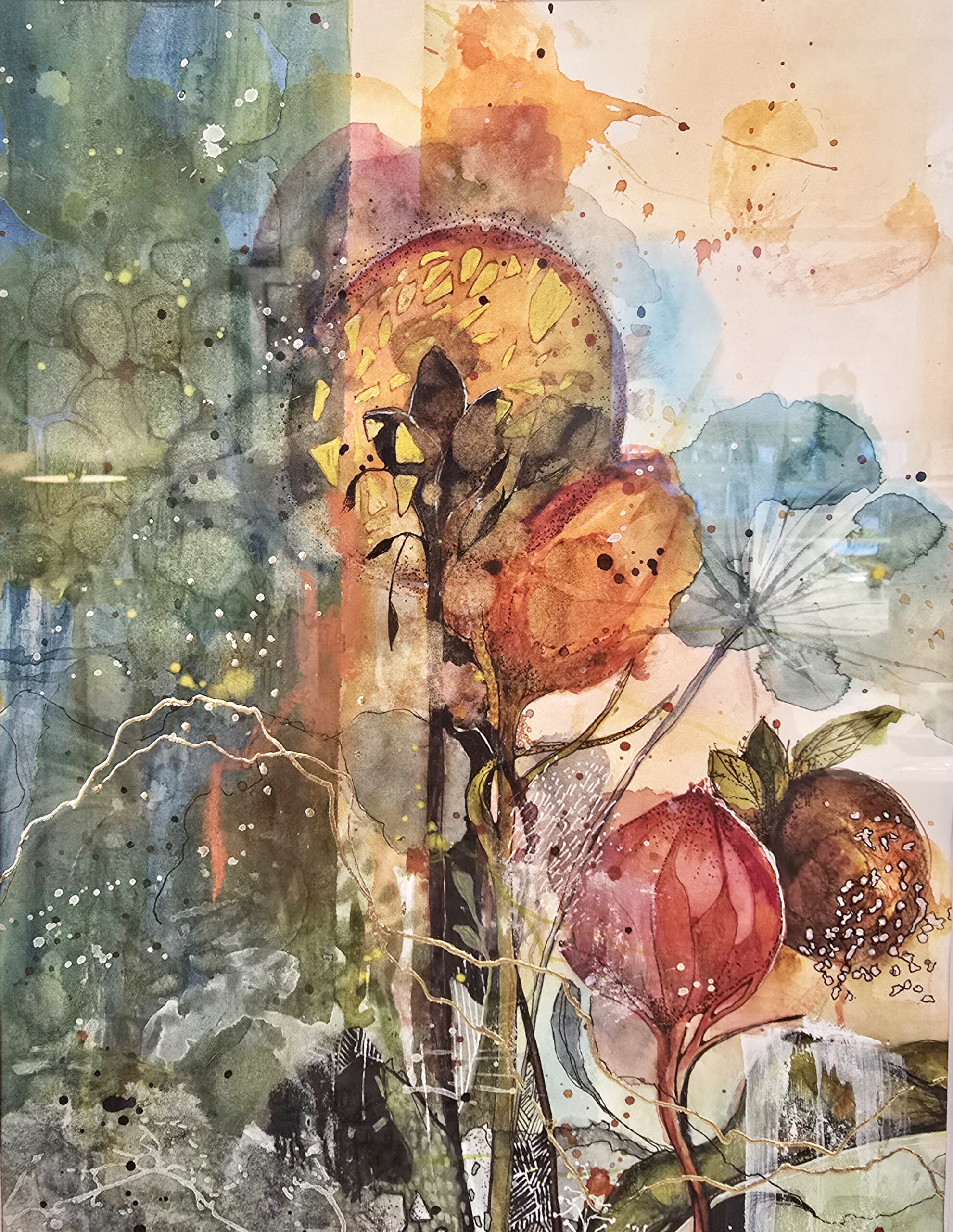Original watercolor and ink abstract paintings incorporating organic movement with geometric anchors. Painted on Arches watercolor paper with gold leaf accents.